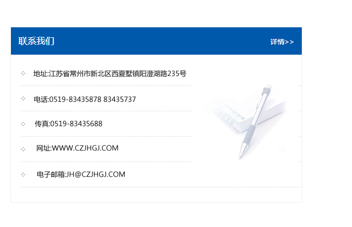 地址:常州市新北區友邦商務大廈1幢16、17層  電話:0519-85101652  傳真:0519-85112595  郵編:213022  網址:www.cz-jiayue_cn.tj-xbh.com  郵箱:xiajifengaa@163.com